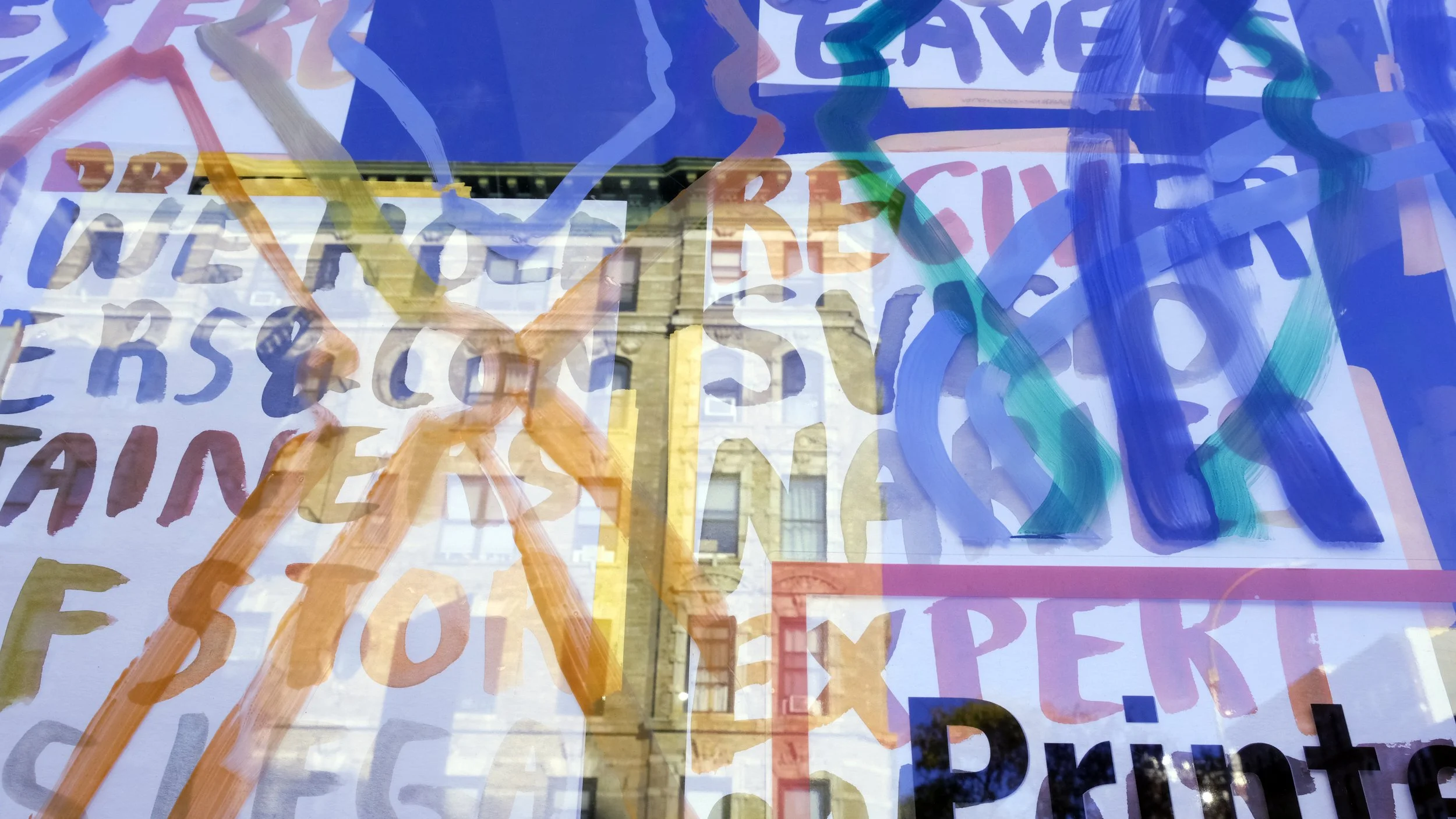 The second layer, functioning as a bulletin board, is a series of 39 works on paper (one for each day the show is up) which will be added periodically to the St Marks Pl-facing window over the course of the installation. The works are double sided with painted text (including contributions from both Lukaza and others listed in the bibliography below) facing the street and patterns facing into the bookstore. As the window becomes populated over time, two lattices will form—one an interconnectedness of paper and shape, and the other a linguistic framework and conceptual legacy that underpins the installation as a whole.
